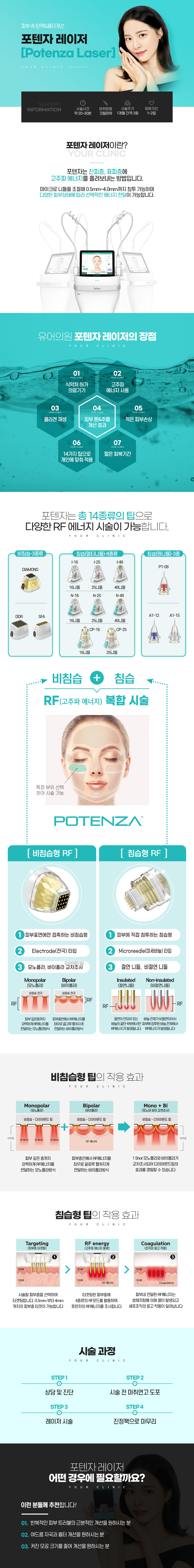 포텐자 레이저는 피부 진피층에 마이크로 니들을 삽입하여 RF(고주파) 에너지를 흘려보내